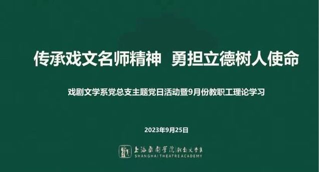 为深入学习贯彻习近平新时代中国特色社会主义思想,进一步推进师德师风建设工作,2023年9月25日中午,戏剧文学系党总支在上戏华山路校区图书馆智慧教室开展了“传承戏文名师精神 勇担立德树人使命”主题党日活动暨9月份教职工理论学习大会。参加本次活动的有原上海市曲艺家协会副主席、上海市群众艺术馆副馆长、戏文系1963届校友徐维新,原戏文系党总支书记张璟,戏文系党总支副书记、系主任陈军,党总支副书记陈莹,以及戏文系的师生代表。活动由陈军主任主持。