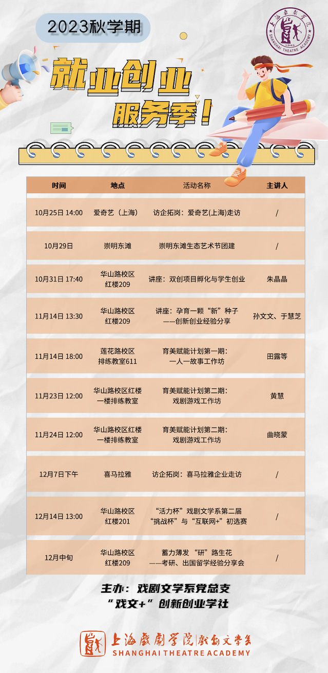 你是否在繁多的就业视野中迷失了方向?对于创新创业,你是否充满热情却又不知如何着手?现在,我们推出了2023年秋季学期戏文系就业创业服务季,专家讲座、平台走访、艺术节活动、双创孵化、优秀师哥师姐经验分享为你提供指导。合力创造,共同开启未来新篇章!快来参与吧!