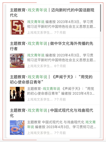 一是以线上形式在戏文系学生家园微信公众号开设“戏文青年说”专栏,推出了戏文青年学习党的二十大报告与创新理论的系列文章和视频。戏文青年将所学所思外化于形,表达对中国式现代化的认识、对中华文化海外传播的见解、对文教、文旅、文创产业的理解、对科艺融合的展望、对乡村文化振兴的体悟,这系列宣讲展示了戏文青年努力成长为堪当民族复兴重任的时代新人的行动自觉。