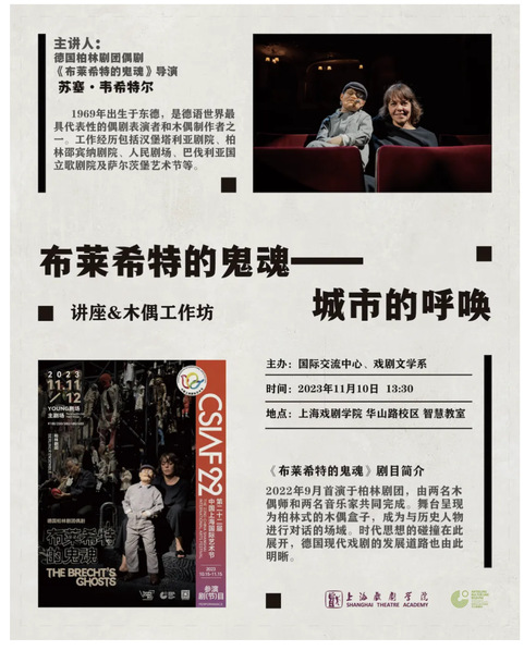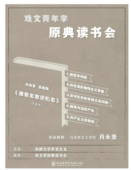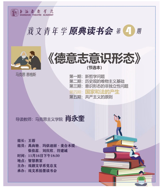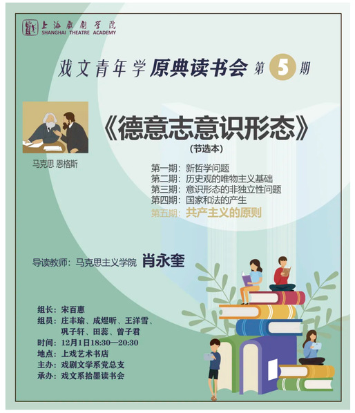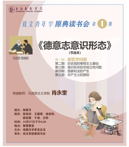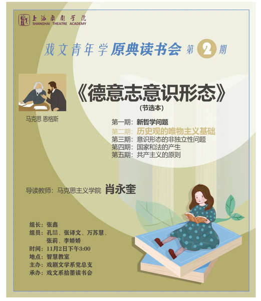 开展共计7期原典读书会活动,活动选择马克思主义经典著作《德意志意识形态》作为阅读书籍,特邀校马克思主义学院肖永奎老师担任指导老师,引领本、硕、博三个学习阶段的同学对经典理论著作深入开展学习交流。读书会期间,组织学生观摩柏林剧团偶剧《布莱希特的鬼魂》,并邀请该剧导演苏塞·韦希特尔举行讲座与木偶工作坊,通过交流加强对西方戏剧现状与发展的了解,从而更好地通过戏剧创作加强中西互鉴,以戏剧见世界、见人生、见未来。