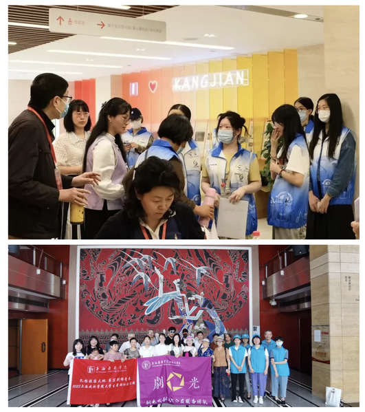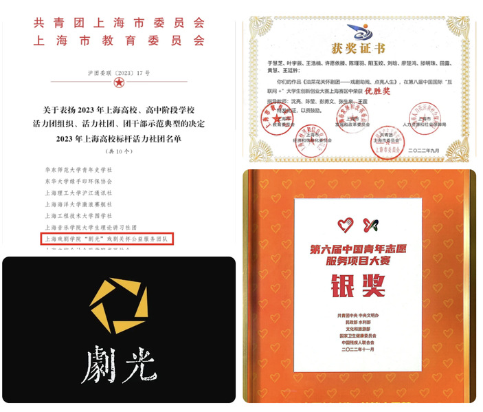 三是以戏剧赋能特殊群体,助残助老助弱,为大力发展社会主义先进文化,提升公共文化服务水平贡献青春力量。戏文系“剧光”戏剧关怀公益服务团队开展线上线下戏剧关怀主题活动,该团队申报的《油菜花关怀剧团》项目荣获第十三届“挑战杯”上海市大学生创业计划大赛银奖,获2023年上海高校标杆活力社团。由于慧芝等学生共同完成的社会调查报告《后疫情下老年心理的新走势、新需求、新特点——以戏剧等艺术对老年心理健康影响为例》关心老年人的心理状况,并积极排演聚焦老年群体的回忆戏剧,该报告荣获第十八届“挑战杯”上海市大学生课外学术科技作品竞赛决赛三等奖。