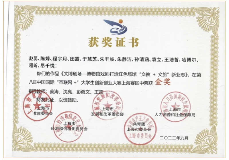 近一年来,戏文青年在学思践悟中不仅收获了真知、锻炼了才干,也在国家级、省市级双创竞赛中屡建新功。在“互联网+”大学生创新创业大赛中收获国赛铜奖一项、市赛金奖一项、优胜奖一项;“挑战杯”上海市大学生创业计划大赛银奖两项、铜奖一项、优胜奖两项;“挑战杯”上海市大学生课外学术科技作品竞赛二等奖一项、三等奖一项。
