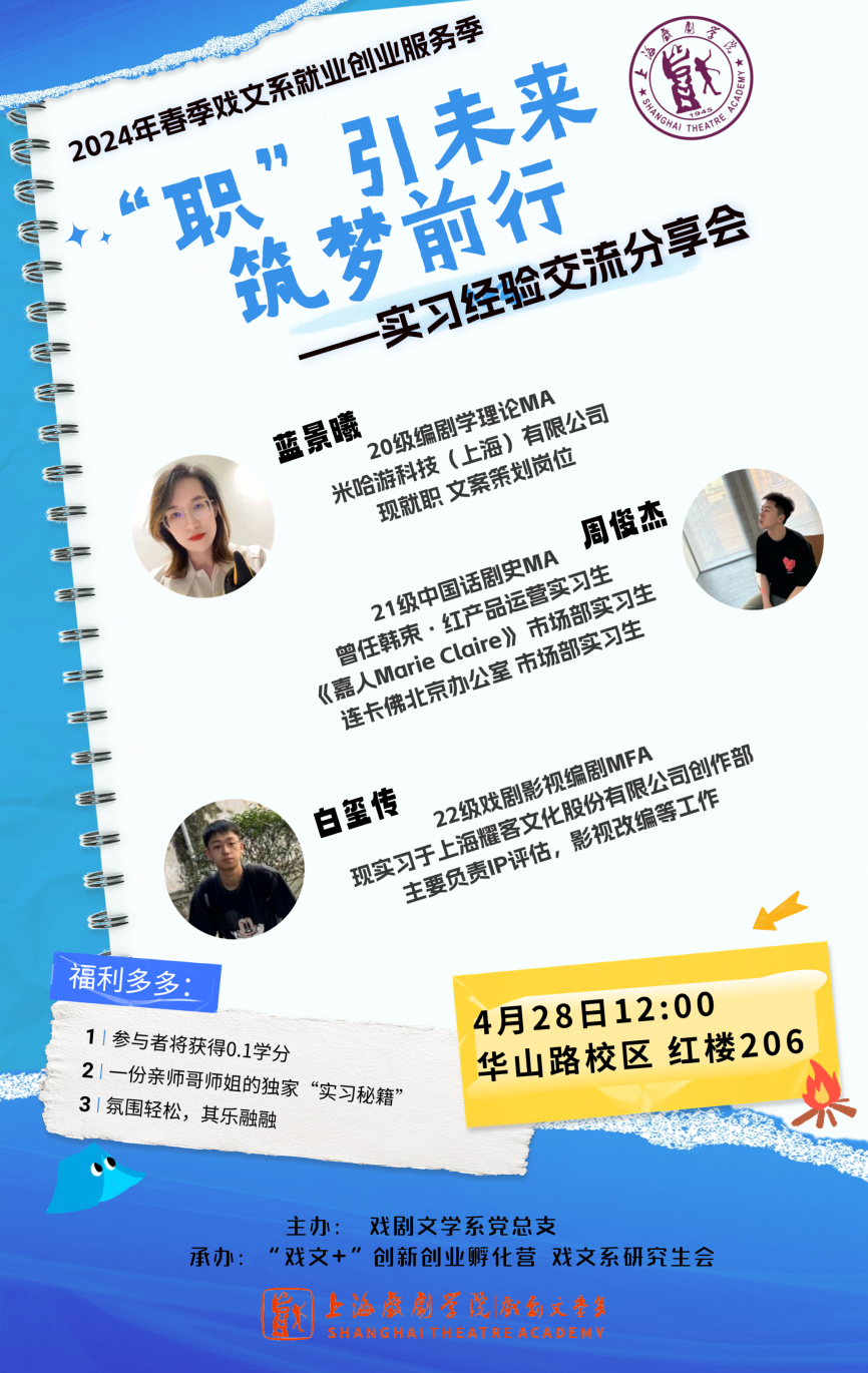 在一场绵绵的春雨过后,“职”引未来,筑梦前行:实习经验交流分享会于4月28号中午在红楼206教室正式举办。本次交流分享会邀请了于米哈游担任文案策划的蓝景曦师姐、拥有多段外企实习经验的周俊杰师哥,以及在耀客影视公司创作部实习的白玺传师哥,三位师哥师姐从不同行业角度分享工作经验,使得在座同学对就业形势有了更全面而深刻的理解。