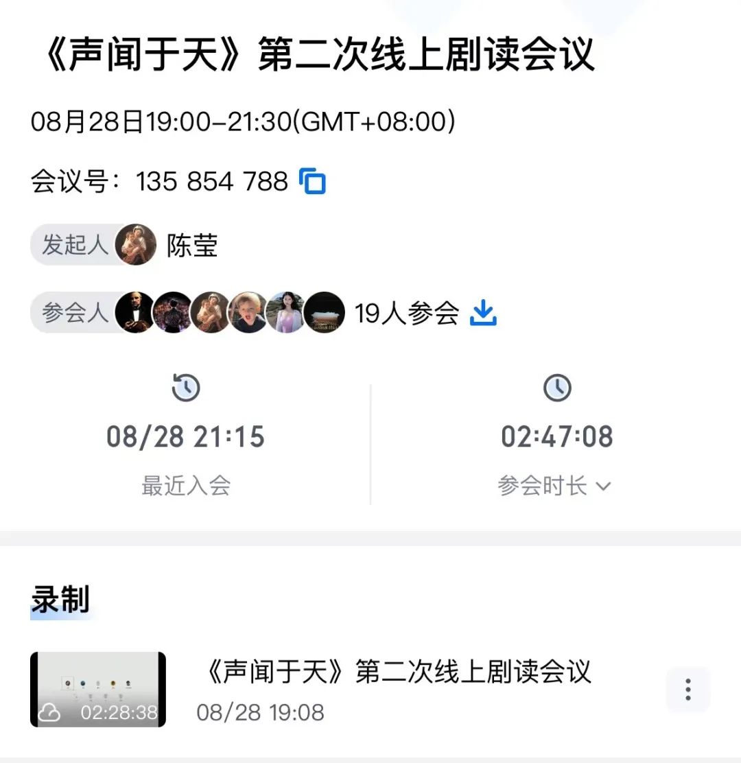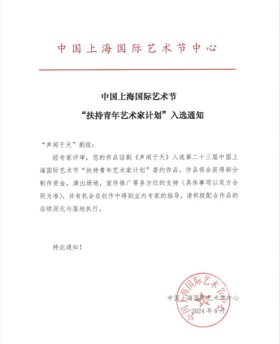 在剧组的不懈努力下,通过学校推荐、现场答辩,七月底,《青年张闻天》改名为《声闻于天》,成功入选第二十三届中国上海国际艺术节“扶持青年艺术家计划”。新的契机与平台,让主创们开启新一段艺术创作之路。
