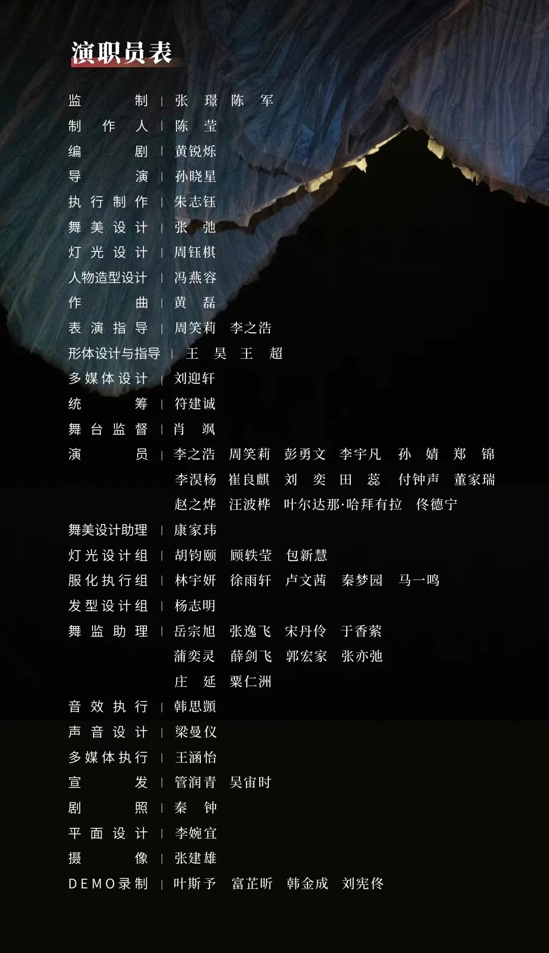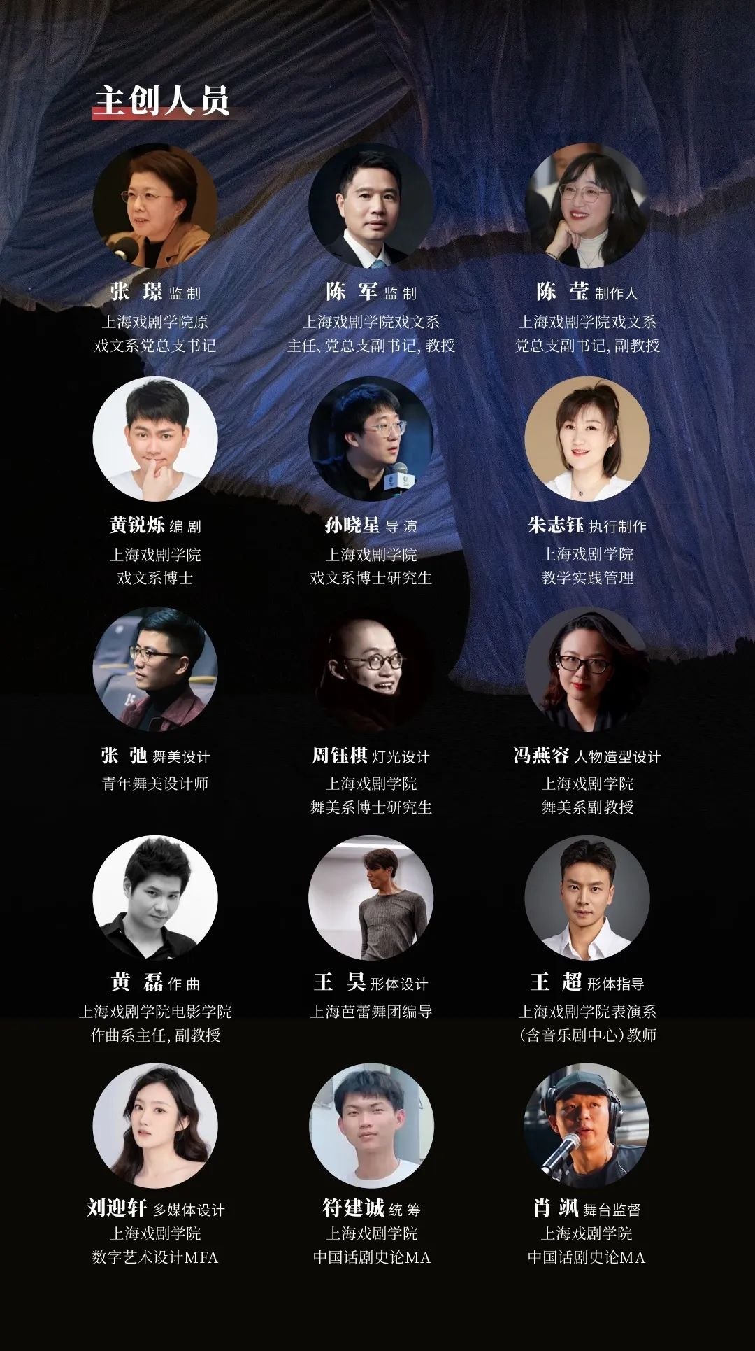 主创团队主要由上海戏剧学院编剧、表演、舞美、灯光、服化、作曲等专业骨干教师、优秀本硕博学生组成。通过跨专业、跨领域的合作,力求呈现出专业院校特有的学术气质、思想追求和美学品格。