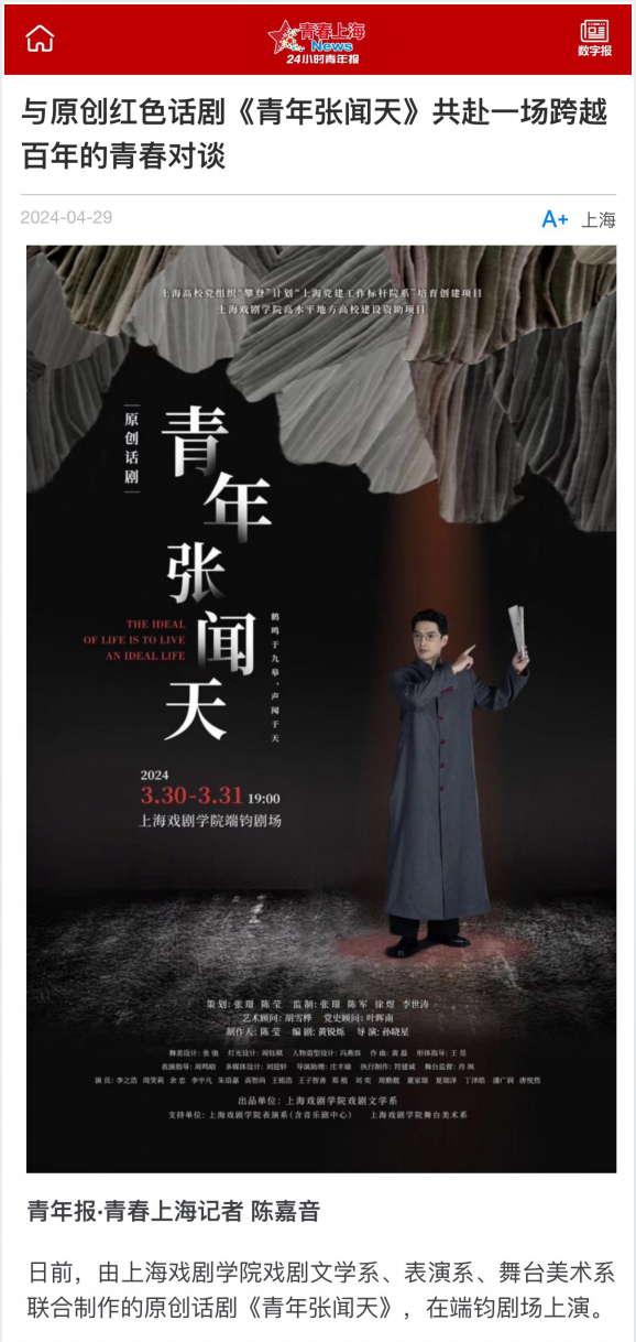 2024年3月30日至31日,由戏剧文学系党总支策划出品,并与表演系党总支、舞美系党总支联合制作的原创话剧《青年张闻天》在上海戏剧学院端钧剧场完成了试演。该剧在流动、自由的时空语境中,以三次与母亲的告别为情感线索,用诗意思维和写意笔法重现张闻天——一位百年前的热血青年从彷徨到觉醒的成长历程,探寻两代青年人的思想共振。