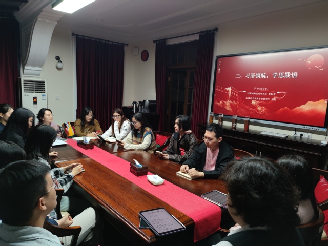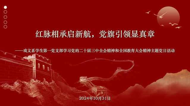 2024年10月31日,为深入学习贯彻党的二十届三中全会和全国教育大会精神,戏剧文学系学生第一党支部以“红脉相承启新航,党旗引领显真章”为主题,于华山路校区党建服务中心开展主题党日活动。活动重点学习了《中共中央关于进一步全面深化改革、推进中国式现代化的决定》,深入学习了习近平总书记在全国教育大会上的重要讲话精神和教育家精神,戏文系党总支副书记陈莹老师、戏文系学生第二党支部书记刘莹莹老师出席,戏文系学生第一党支部书记管润青老师主持,本次主题党日活动是24级研究生新生党员第一次参与我系学生支部活动。