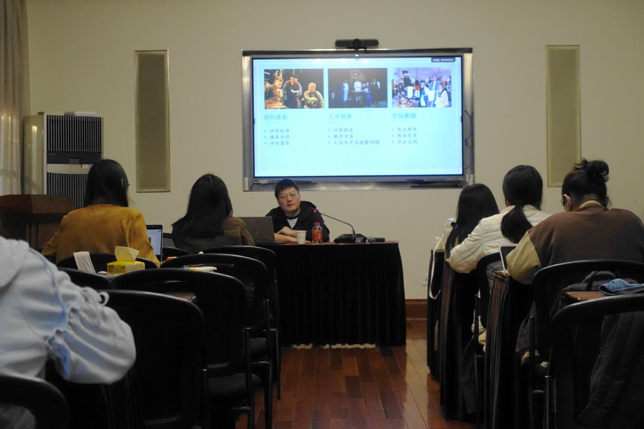 在确定话题后,需要通过调研收集相关材料。他从自己与浙江当地院团沟通交流的经历入手,谈起收集材料的交流策略。提前给对方准备问题,不一定能得好的交流效果;可以从谈起他们的当前工作开始,构建好的谈话氛围,在双方放松的交谈情况下交流,获取可靠的信息。在收集完资料后,我们能逐渐发现需要解决的问题。其次,要提出解决问题的方案。首先可以看是否能从其他相似的问题中寻找经验,如借鉴其他剧种对于类似问题的处理经验。在有了方案后,其是否可行还需进行市场的检验。黄老师鼓励同学们将已经落地过的方案进一步孵化扩展。