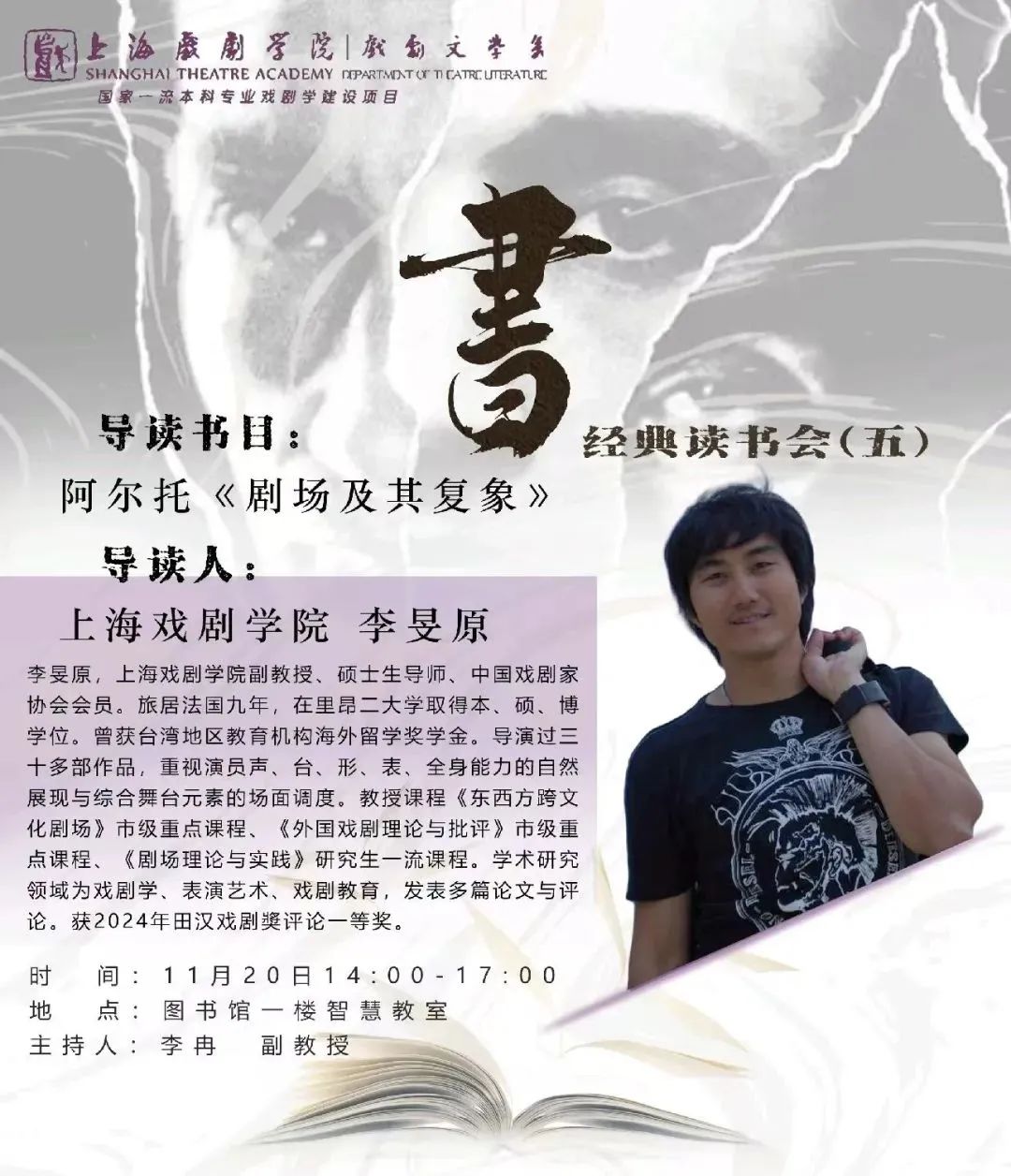 李旻原老师为开云足球首页官网下载副教授、硕士生导师、中国戏剧家协会会员。他旅居法国9年,在里昂二大学取得本、硕、博学位。曾获台湾地区教育机构海外留学奖学金。导演过三十多部作品,重视演员声、台、形、表、全身能力的自然展现与综合舞台元素的场面调度。教授课程《东西方跨文化剧场》市级重点课程、《外国戏剧理论与批评》市级重点课程、《剧场理论与实践》研究生一流课程。学术研究领域为戏剧学、表演艺术、戏剧教育,发表多篇论文与评论。获2024年田汉戏剧奬评论一等奖。李老师对法国文化的深入了解和丰富的戏剧实践经历,对阿尔托作品的独到理解令现场学生十分期待。