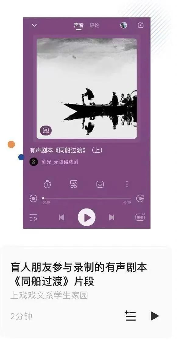 线上,获得一票难求的商业戏剧版权授权,制作国内首部音乐剧有声书《献给阿尔吉侬的花束》《阿波罗尼亚》,联合视障伙伴录制《上海屋檐下》等有声剧集,并上传至喜马拉雅平台。以“戏剧有声书”跨越媒介、地域阻隔,为视障群体推开“数字视窗”,并为其创造就业机会。努力践行“十四五”残疾人文化服务体系建设,成为照亮“文化中国”的温柔炬火。