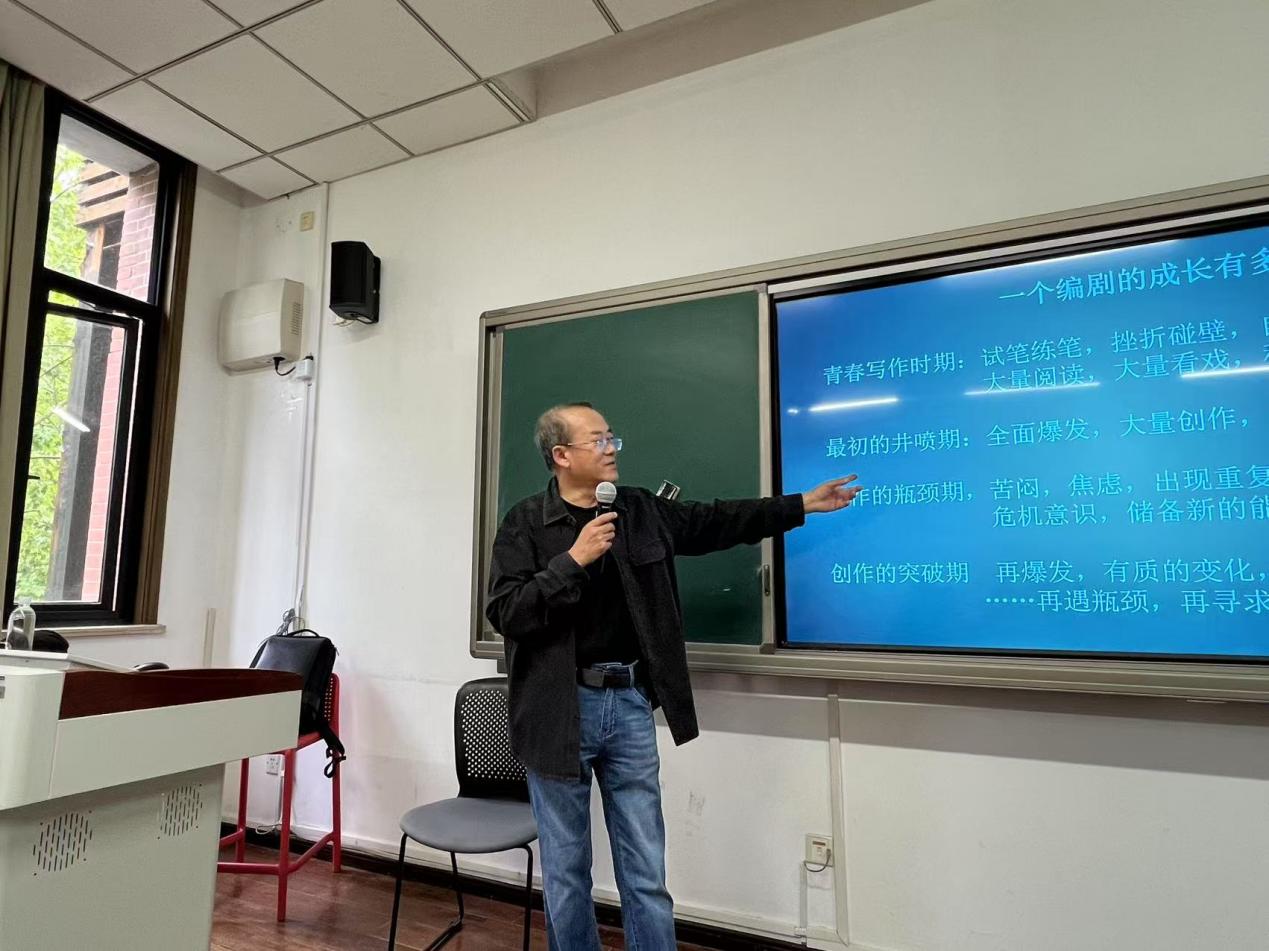 2025年5月8日周四下午,窗外大雨如注,红楼206教室内却座无虚席。著名剧作家李宝群老师带着他数十年的剧本创作经验,为上戏师生带来了一场主题为《剧本创作四十周年——回望与思考》的精彩讲座。作为国家一级编剧,李宝群老师曾创作过六十余部戏剧作品,作品数次入选国家舞台艺术精品工程十大精品,多次荣获文化部文华大奖、中宣部精神文明建设“五个一工程”奖,曹禺戏剧文学奖,金狮奖等国家级奖项。