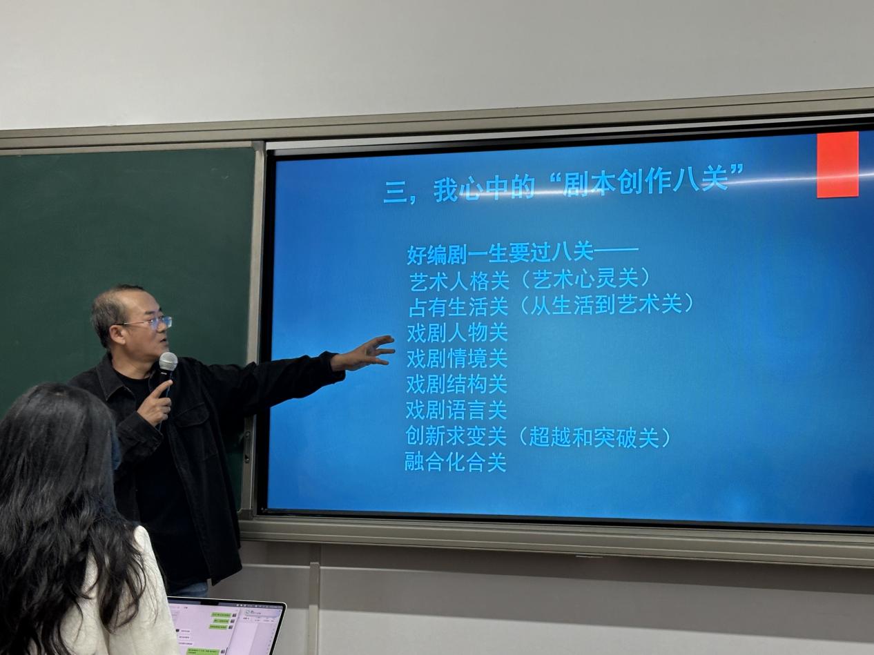 互动环节,李宝群老师热情地回答了同学们的提问。他呼吁青年编剧们要勇于试错,不断尝试,并且不要盲目崇拜所谓的新潮流派,作为学生应先扎扎实实地坚持现实主义创作,期待青年人能够为中国戏剧的未来注入新的活力与希望,他的话让在场的每一位同学都被深深触动。这场持续四个小时的讲座不仅是李宝群老师个人创作经验的分享,更是对当代戏剧现状与未来发展的深刻剖析,让在座师生们都受益匪浅。