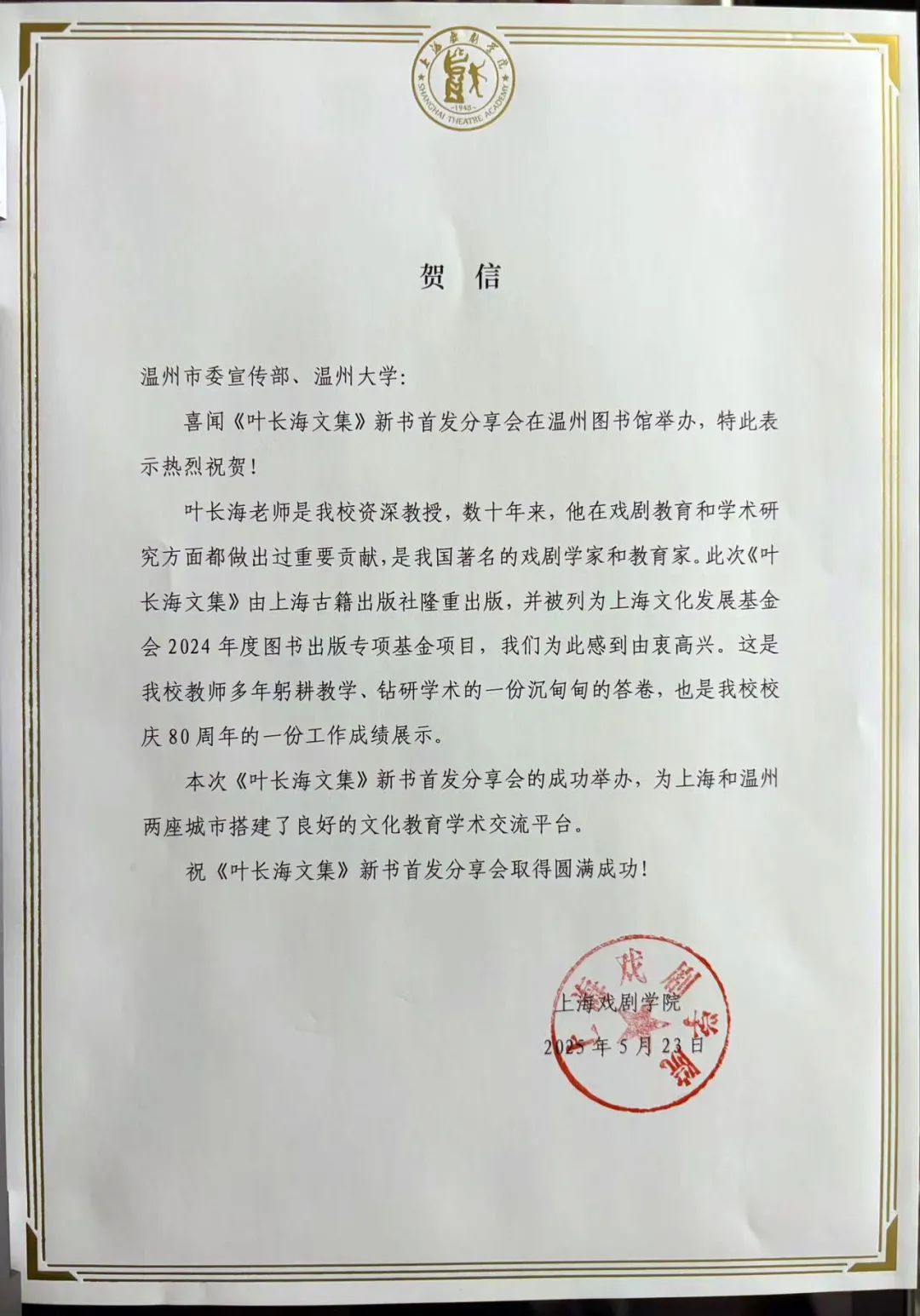 上海戏剧学院和上海市文史研究馆也发来贺信,祝贺《叶长海文集》出版及新书首发分享会圆满成功。上海戏剧学院称《叶长海文集》是上戏教师“多年躬耕教学、钻研学术的一份沉甸甸的答卷”,也是“校庆80周年的一份工作成绩展示”。上海文史馆则评价文集:“不仅是对叶教授教学和学术成果的集中展示,更为学界提供了研究中国传统文化的重要范本。”