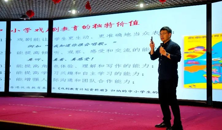 在精彩纷呈的教学成果展示环节后,应魏校长的盛情邀请,彭教授为全体师生带来了一场富有启发性和互动性的主题演讲——《中小学戏剧教育的价值与途径》。他结合丰富的实例,深入浅出地阐述了戏剧教育在中小学生人格塑造、情感表达、创造力培养及团队协作能力提升等方面的核心价值,并分享了多种戏剧教学的方法与途径,获得了观摩师生的热烈反响。