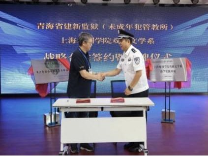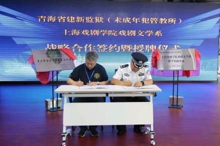 参观结束后,青海省建新监狱(未成年犯管教所)与上海戏剧学院戏剧文学系战略合作签约暨揭牌仪式顺利举行。仪式开始前,青海省建新监狱政委李明荣与戏文系主任沈亮教授致辞,沈主任表示,“朗月”涉罪未成年人心理重塑服务项目极大地发挥了戏剧的教育意义,极具典型性与创新性,不管是戏剧教育工作坊,还是根据真实事件改编创作的戏剧,都对涉罪未成年人自我反省、回归社会具有重要意义。需要更多公开改编案例与创新形式,培养更多相关人才,推广“三方合作”架构,可以面向全国推广相关经验。随后双方正式签约,青海省监狱管理局刑罚执行(教育改造)处长仁本与戏文系党总支副书记、副主任陈莹揭牌,确立了“资源共享、优势互补、协同创新、互利共赢”的合作方向,明确了在教育改造理论课题研究、矫治人才培养、戏剧与矫治结合的实践等方面的合作内容。