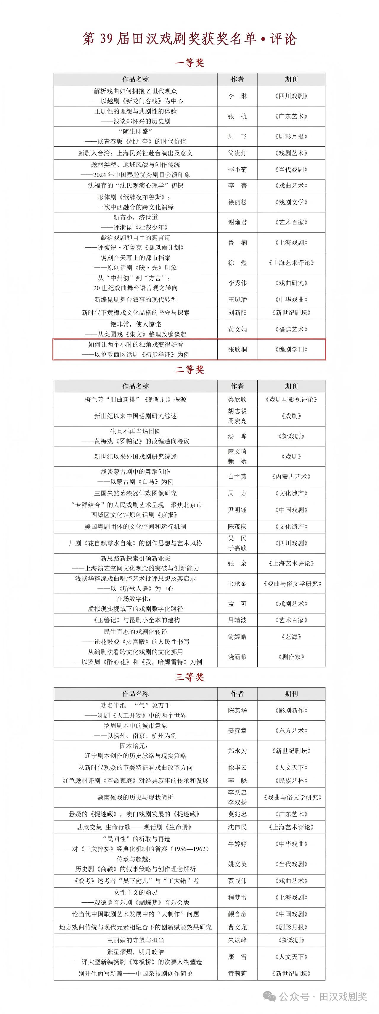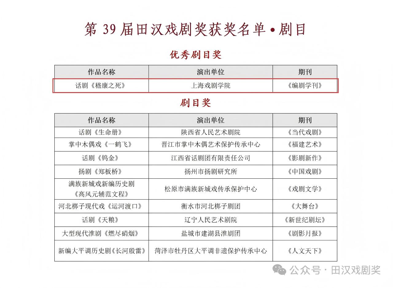 《编剧学刊》创办人、主编,我系陆军教授出席参评活动,本辑轮值主编、上海戏剧学院教务处副处长(主持工作)李世涛副教授代表学刊介绍报送的2部作品、3篇文章。最终,2部作品和3篇文章均斩获佳绩:话剧《嵇康之死》(编剧:肖留,导演:伊天夫,演出单位:上海戏剧学院)获得唯一优秀剧目奖,话剧《北京塔楼》(编剧:李宝群)获得剧本类一等奖。《如何让两个小时的独角戏变得更好看——以伦敦西区话剧<初步举证>为例》(作者:张欣桐)获得评论类一等奖,《人工智能(AI)编剧的叙事自主与伦理反思》(作者:苗若木)获得理论类二等奖,《听见契诃夫:论<樱桃园>中“绷断的琴弦”》(作者:郑钲)获得理论类三等奖。