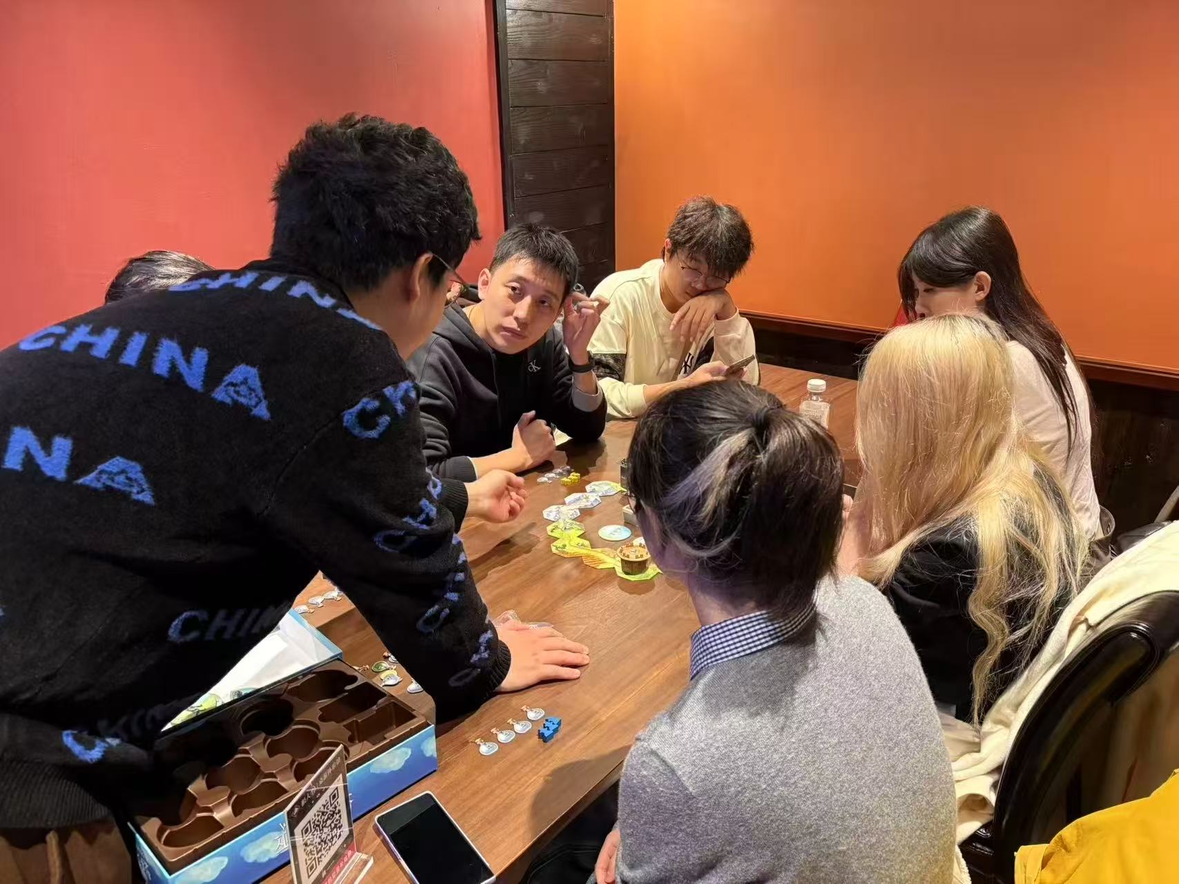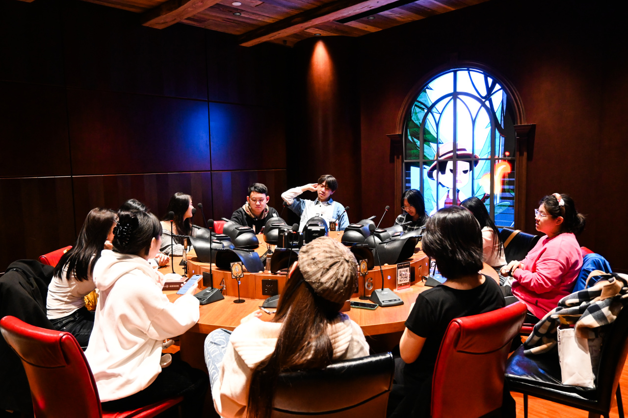 在假面科技的桌游体验区,师生们分组参与了两款桌游的现场体验。从策略博弈到情境演绎,同学们在游戏中感受叙事张力与互动机制的设计巧思,也对戏剧创作与游戏化叙事之间的融合可能有了更直观的认识。