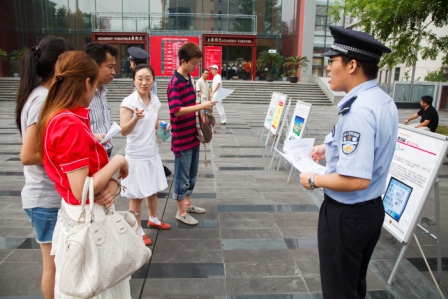 当天一早,宣传展板在报到现场一字排开,保卫处工作人员和文保分局干警现场宣传,结合高校新生入学报到的治安特点,提醒师生不要使用违章电器,防扒窃、防溜门、防拎包,“不要对陌生人说话”,保管好自身财物,注意人身安全。并在现场向师生家长发放了宣传资料一批,耐心解答学生提问。