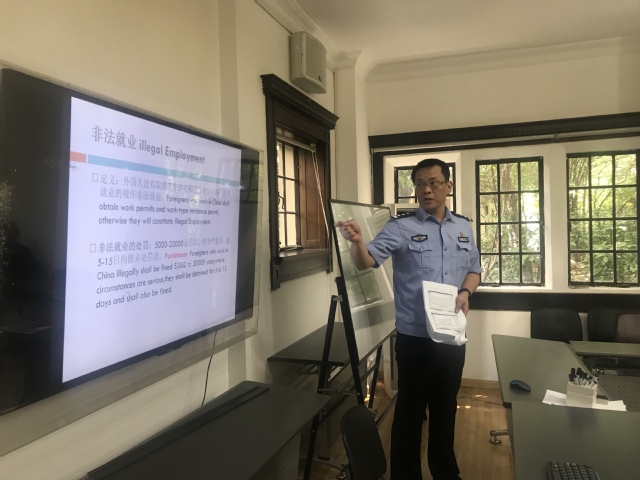为加强对我校留学生的法律法规教育、提高留学生的法律意识,9月12日上午,开云足球首页官网下载国际交流中心为留学生开展中英文法宣讲座。本次讲座邀请到上海市出入境管理局警官张轶军主讲,我院2019级留学生及留学生办公室老师参加。