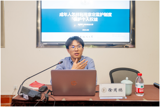 主讲人徐周鹏老师,系吉林大学民商法学博士,主要研究方向为民商法、卫生健康法,现任华东政法大学中国法治战略研究院助理研究员。在《社会科学战线》等核心期刊发表多篇论文。参与国家哲学社会科学基金项目多项。在本次民法典进校园专题讲座《成年人怎样利用意定监护制度保护个人权益》中,徐周鹏老师通过深入浅出的讲解和具体案例的分析解读,为大家普及了民法典有关知识和各分编亮点,尤其是针对成年人意定监护的特点,着重介绍了未成年人监护与成年人监护区别、成年意定监护协议的成立与否相关案例。