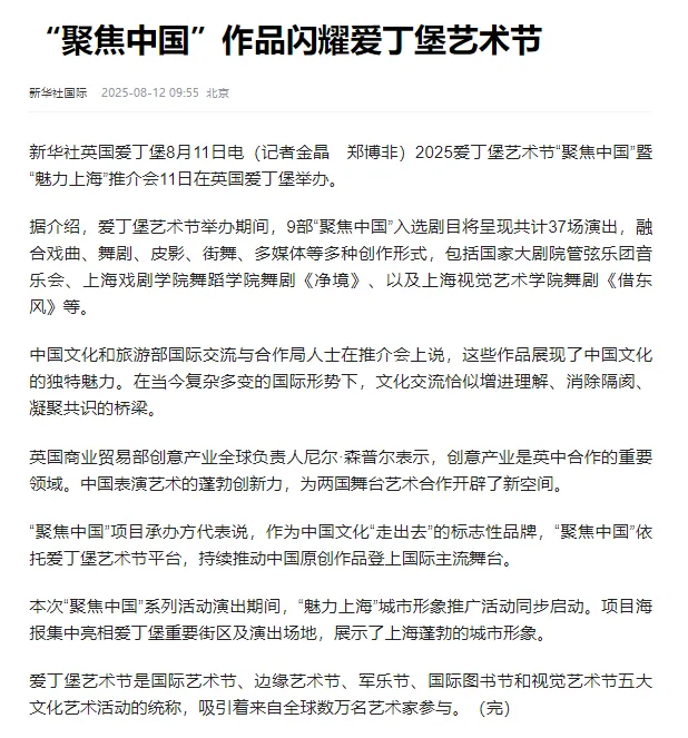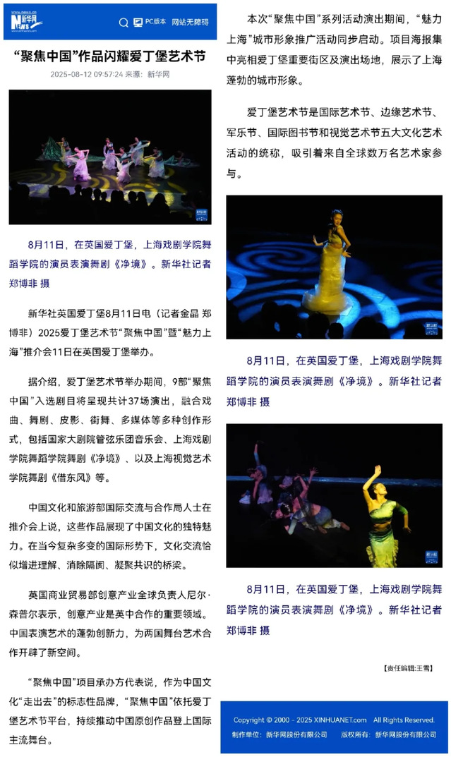原创舞剧《净境》参加爱丁堡艺术节,是上戏代表团此次赴英的重要目的。《净境》由上戏舞蹈学院副院长周蓓编剧兼导演,获得上海文化发展基金会和上海国际舞蹈中心基金会支持,经中国上海国际艺术节遴选推荐,进入爱丁堡艺术节“聚焦中国”正单元。作品呼应艺术节Dare to Discover(敢于探索)的主题,在英期间完成三场剧场演出及四场快闪路演,观众反响热烈。国务院新闻办公室、文化和旅游部官网、人民日报、新华社国际频道、新华网、东方卫视、凤凰卫视等主流媒体报道中均对《净境》给予热情评价,英国主流媒体也将其评为四星节目。