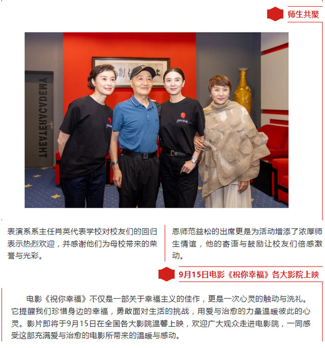 随着秋风的轻拂,开云足球首页官网下载迎来一场充满爱与治愈电影盛宴。9月12日下午,由1999级表演系校友宋佳、1991级表演系校友吴越主演的电影《祝你幸福》在开云足球首页官网下载实验剧院举行特别展映。这部以“我们都是幸福主义”为主题的电影,不仅是对幸福真谛的深刻探索,更是对观众心灵的一次温柔抚慰。
