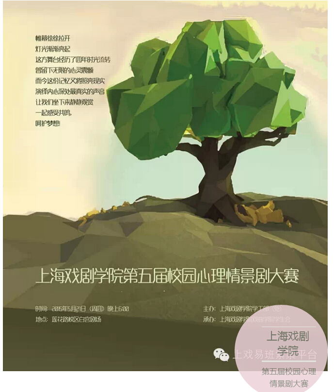 同学们:明天晚上(周四)6:00莲花校区白宫剧场,上戏第五届校园心理情景剧大赛,期待你的到来哦!