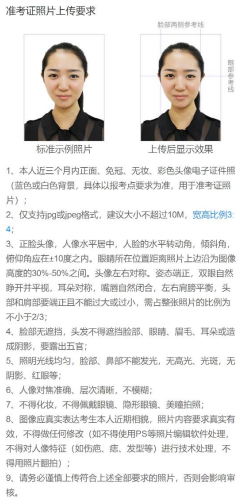 图像应真实表达考生本人近期相貌,照片内容要求真实有效,不得做任何修改(如不得使用PS等照片编辑软件处理,不得对人像特征(如伤疤、痣、发型等)进行技术处理,不得用照片翻拍)